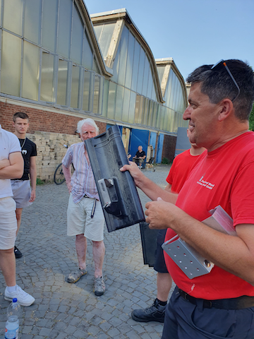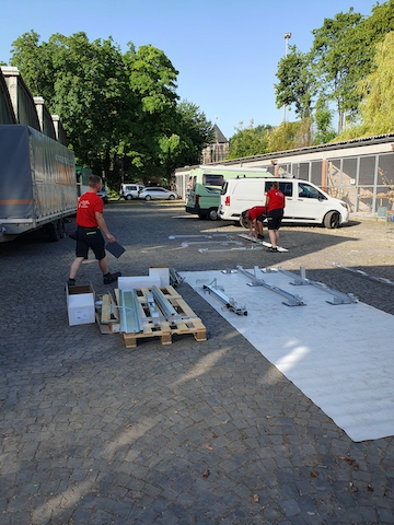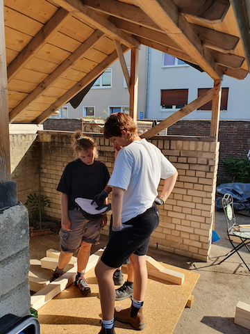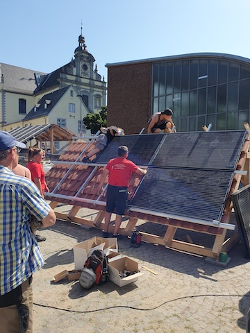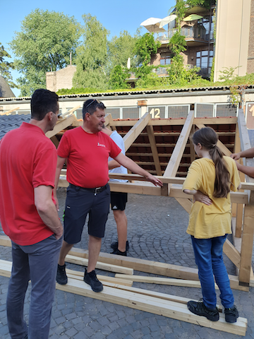 Bei der praktischen Umsetzung wurde das Camp von Dachdeckermeister Peter Frings von der Firma „Dach und Wand aus einer Hand“ (LINK) unterstützt. Er hatte zufällig von der Camp-Idee erfahren und spontan seine Hilfe angeboten und zudem die Firma Lorenz Montagesysteme (LINK) an Bord geholt, die großzügig Material zur Verfügung stellte. Unter anderem bauten sie ein Messemodell eines Gründachs mit Solaranlage in unserer Werkhalle auf, dass die Teilnehmer*innen des Camps im Lauf der Woche verschiedenen Besuchern selbst erklären konnten. Das Dachdeckerhandwerk zeigte Interesse am Camp und berichtete in seiner Verbandszeitung DDH (LINK), und der Obermeister der Dachdeckerinnung Bergisches Land schaute ebenfalls vorbei.