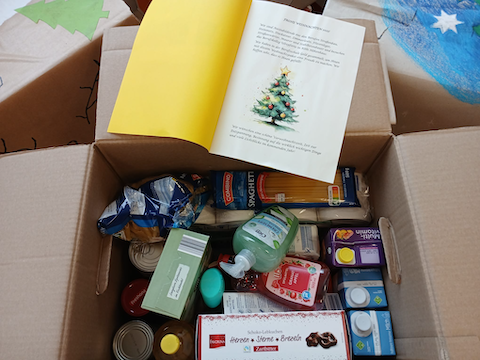 Seit vielen Jahren sammeln wir an beiden Standorten in der Vorweihnachtszeit in allen Klassen Geld, um davon Lebensmittel und Hygieneartikel für Weihnachtspakete zu kaufen. Diese Umzugskisten voller guter Dinge werden für bedürftige Menschen in Köln zusammengestellt, gestaltet und an vom DRK ausgewählte Menschen verteilt.