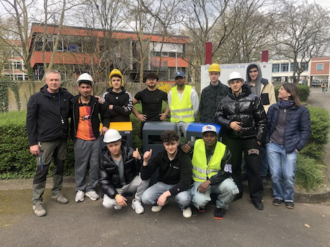 Schülerinnen und Schüler der Internationalen Förderklasse und der Berufsfachschule 1 mit Sprachqualifizierung des Berufskolleg Ulrepforte haben Bildungsgang übergreifend das Schülerprojekt „Neues Mülltrennsystem für den Schulhof“ realisiert. Dafür haben die Schülerinnen und Schüler an fünf Stationen auf dem Schulhof je drei unterschiedlich farbige Metallbehälter aufgebaut. Jede Farbe steht für eine Müllsorte. Die Schülerinnen und Schüler konnten bei dem Projekt ihre erlernten Kompetenzen in der Arbeitsvorbereitung und den Umgang mit Maschinen und Handwerkzeugen aufzeigen und einsetzten.